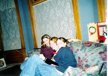 This is a picture of some | more of my friends. I am the one in the middle, Jodi is the one on my right with the maroon shirt on, and Abbey is the one on my left with a blue shirt on. This picture was taken at Abbey's house.